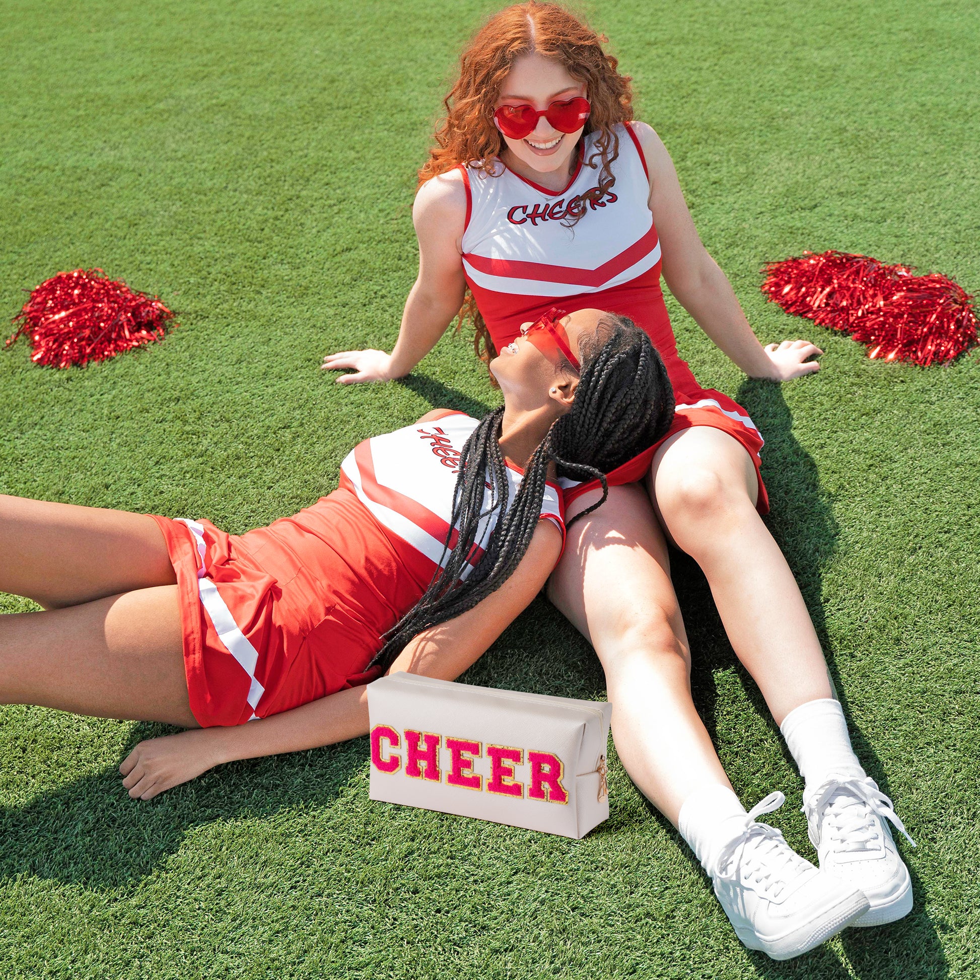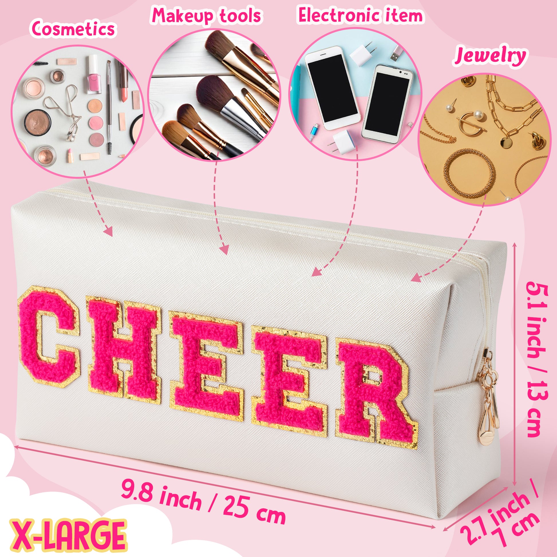 - Vibrant CHEER Chenille Patch Style: Elevate your daily routine with our dazzling shell gold cosmetic bag, featuring vibrant hot pink letters "CHEER" sewn into the center. The surrounding of gold glitter makes these hot pink letters truly stand out. This bag is more than just an accessory; it exudes a warm, cheerful atmosphere that brightens your every moment.