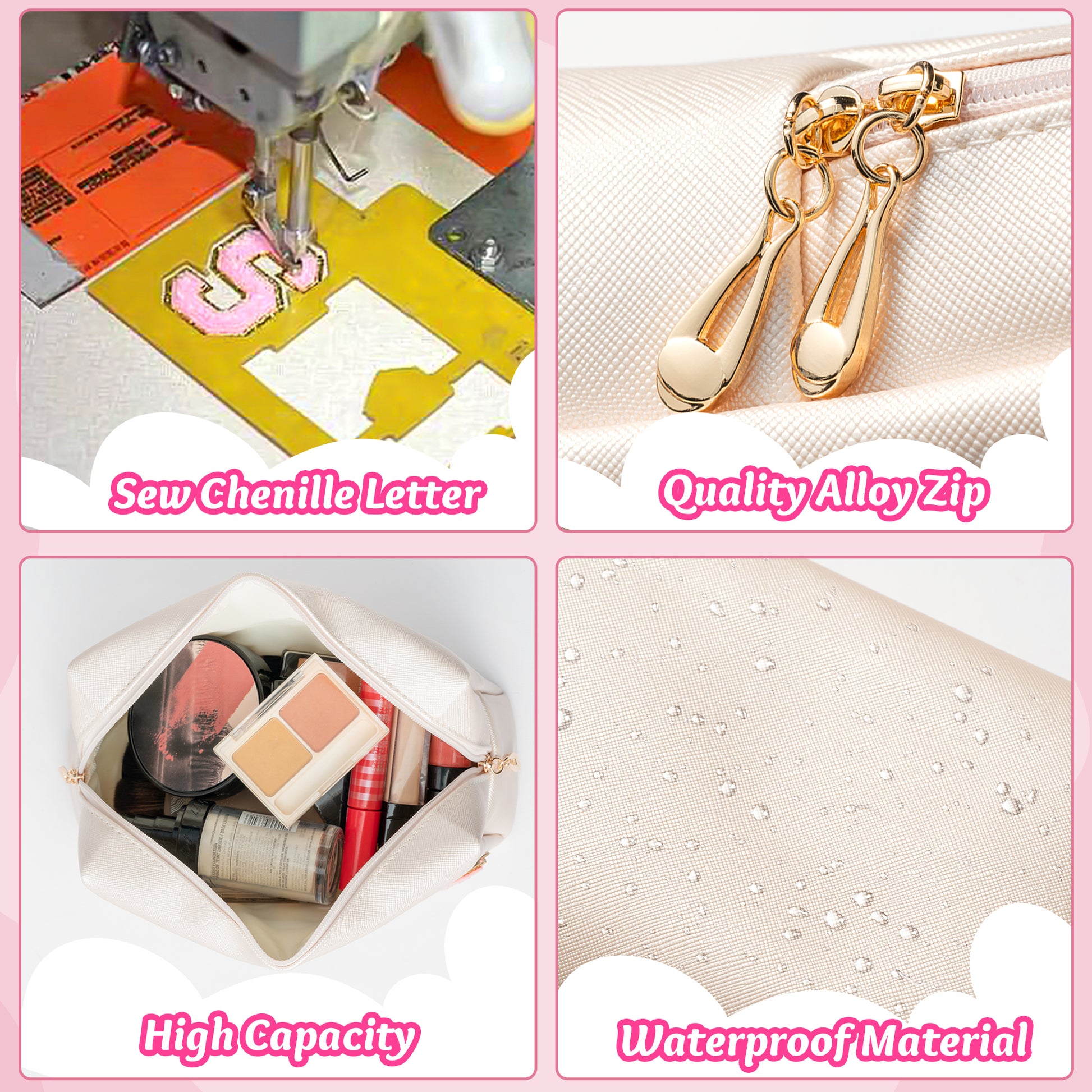 Y1tvei Preppy Patch CHEER Hot Pink Chenille Letter Extra Large Cosmetic Bag PU Leather Waterproof Portable Varsity Cheer Letter Makeup Toiletry Pouch Travel Organizer for Cheerleader Girl (Shell Gold)